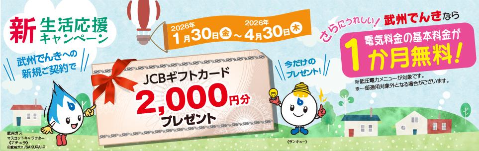 | [対象条件] | 2026年1月30日(金)~2026年4月30日(木)まで(当日消印有効)に「電灯プラン」「動力プラン」「武州さすてな電気」を新規にお申し込みいただき(メニュー変更は対象外)、かつ電気の需給開始日が2026年1月23日(金)~2026年7月31日(金)までの方。 当社既存プランから武州さすてな電気へのお切り替えは、本キャンペーンの対象外となります。 |
